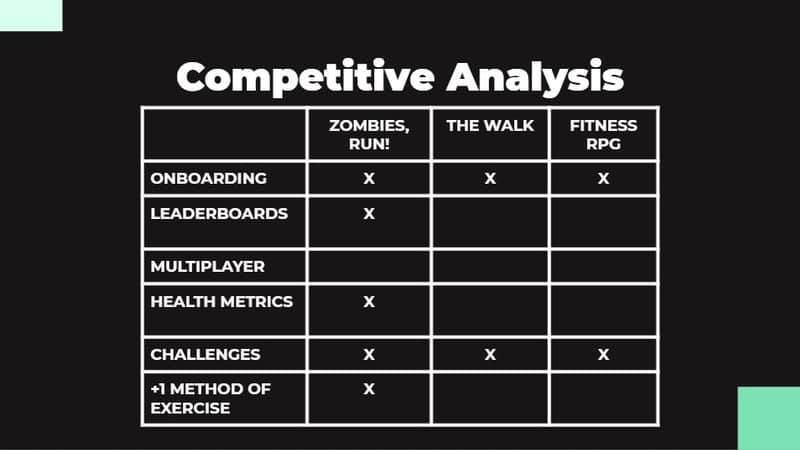 As seen from the chart above, Cardii.io's greatest existing competitor was "Zombies, Run!", a solo-player running mobile application. Zombie's, Run! had a variety of features, like leaderboards and health metrics that The Walk and Fitness RPG both lacked. With the goal of making Cardii.io a game that was both competitive and collaborative, we felt that the leaderboards functionality was a necessary component to incorporate in our designs.
