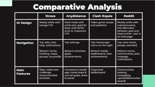 The parameters we compared Cardii.io's comparators to were UI Design, Navigation and Features, to which we chose dedicated running fitness apps, focusing on aspects of the UI and navigation. Clash Royale was chosen as a comparator with the intent to understand clean game design visuals/aesthetics and to get a feel for how a top game designs their leaderboard system. Reddit was incorporated as a comparator for Cardii.io's community boards function.