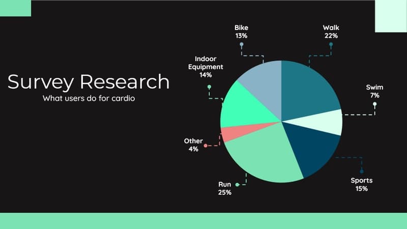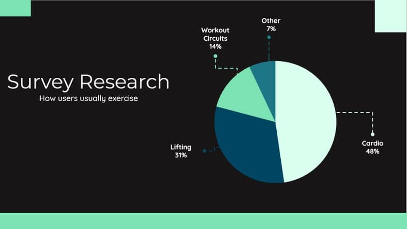 A large portion of our research was dedicated to pulling in extensive survey data to gain foundational understanding of our user's preferences when it came to exercise, specifically cardio. As pulled from these three survey questions with 150 user responses, the number one form of exercise users conducted was cardio and Running, Walking and Biking sat very high on the list of cardio activities our users conducted. An additional key data metric we looked for was consistency in our user's exercise habits, showing that over half of our users work out four to seven times a week.