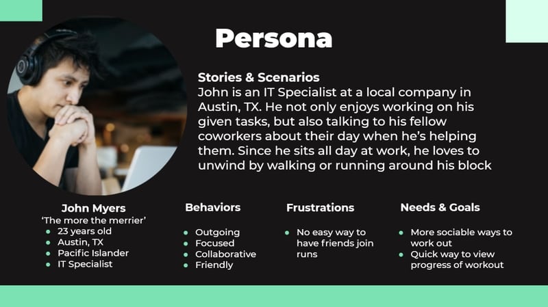 After synthesizing our affinity map, we began creating our ideal user who would be interacting with the app. Our persona John was created to emphasize a need for social aspects while still focusing on a motivator that will encourage his exercise habits.