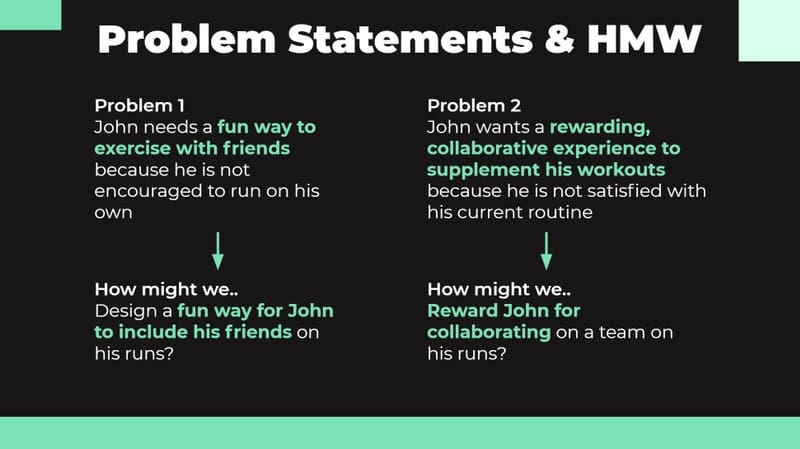 Once our persona was created, we put together a couple of problem statements and how might we statements to guide our design focus. The problem statements were designed to highlight key features that John lacks in his day-to-day routines, while the how might we statements were created to address the said issues that John was experiencing.