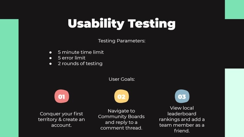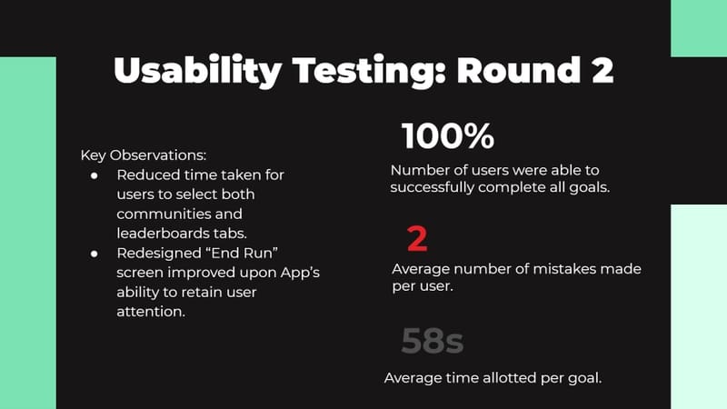 Our results for the first round of testing were 3 of our 5 users successfully completed each task while maintaining both the time and error limits. Users most commonly were making errors on the community board page due to a lack of clarity on where they needed to click to access the forum posts. Along with this, other errors included misclicks in the post-run screens and navigating the leaderboards, so for our iterative designs, we decided to polish up these areas of confusion.