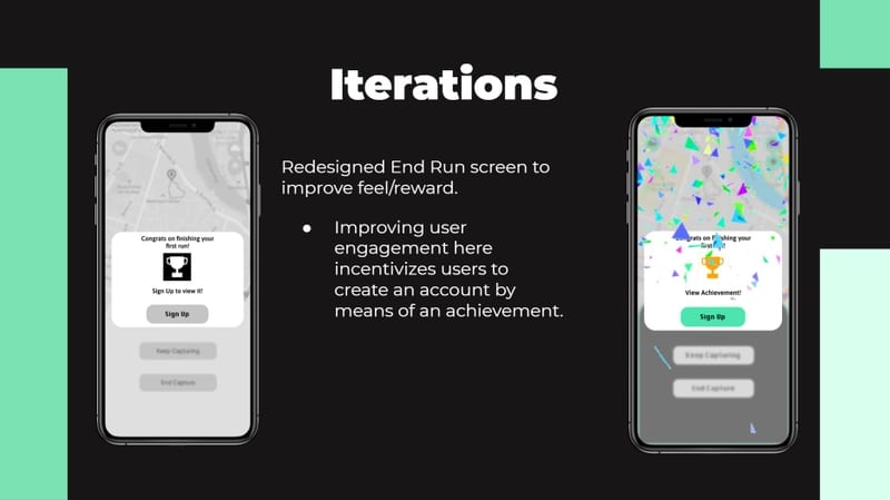 One of the areas I noticed was unclear for our users was the "End Run" screen that prompted users to create an account. I felt that the wording in our mid-fidelity prototype didn't send a clear enough message congratulating our users on completing their first run. One of the driving factors of Cardii.io is its sense of progress and achievement and we wanted to incentivize our users to create accounts to increase engagement.
